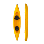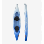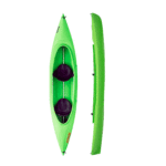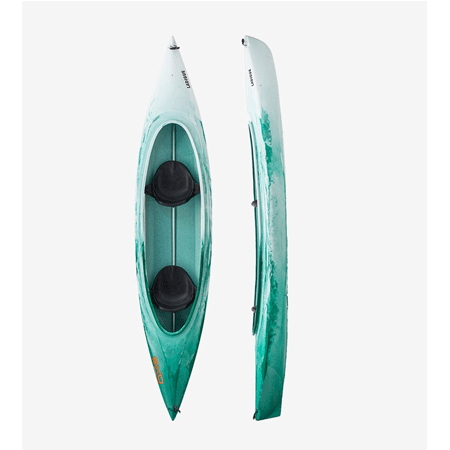 Open kayak biposto, è predisposto all’arretramento del sedile anteriore nella posizione centrale allo scopo di trasformarsi in un mezzo singolo ideale per la pesca.